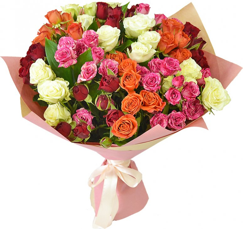 Восхитительный букет из разноцветных кустовых роз - это прекрасный выбор для подарка дорогим и близким вам людям. Этот букет станет центральным украшением любого торжества - он порадует всех своей красотой, изяществом и благоуханием. Так же смело можете дарить его своей любимой, так как розы - это  цветы говорящие о любви.